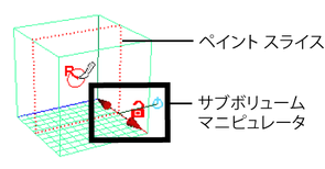 ペイントするスライスの位置と厚みは、スライスのコーナーに表示される流体マニピュレータで制御します。詳細については、3D コンテナのサブボリュームを表示するを参照してください。