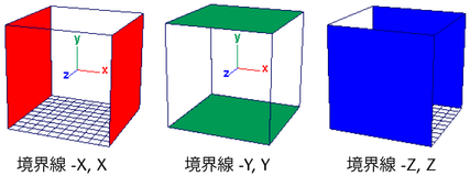 -X、-Y、または、-Z 境界をそれぞれ閉じて、壁のように機能させます。