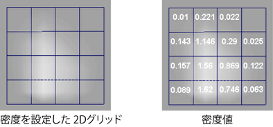 次の 2D 流体の例は、グリッド内の密度(Density)を示しています。左側はシェーディング表示モードで表したイメージです。右側のイメージには、各ボクセルの実際の密度(Density)値が表示されています。