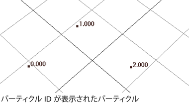 パーティクル オブジェクトの任意のアトリビュートの現在の値を表示します。これは、特定のフレームにおける速度などのアトリビュート値を知りたい場合に便利です。既定では、数値(Numeric)レンダー タイプのパーティクル ID が表示されます。