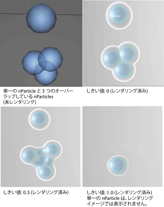しきい値(Threshold)はクラウド(Cloud)またはメタボール サーフェス(Blobby Surface)球同士のサーフェス ブレンディングをコントロールします。しきい値(Threshold)は、レンダー後の nParticle の外観の決定に重要です。