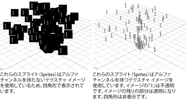 テクスチャ イメージにアルファ チャネルがない場合、イメージは不透明になり四角形に表示されます。テクスチャ イメージにアルファ チャネルがある場合は、スプライトはイメージの透明度を使用します。四角形を表示しないようにするには、元のテクスチャ イメージの周辺部分を透明にする必要があります。