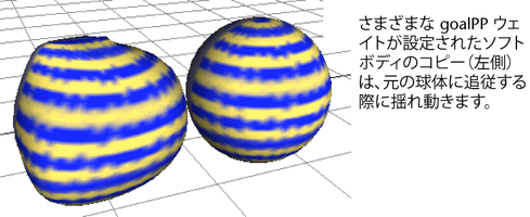 たとえば、複製し、コピーをソフト ボディにする(Duplicate, Make Copy Soft)を選択し、非ソフト ボディをゴールにする(Make Non-Soft a Goal)をオンに設定して球をソフト ボディにしたとします。次に、元の球であるゴール オブジェクトのモーションをアニメートするキーを設定します。最後に、ソフト ボディのコピーのパーティクルにさまざまなゴール PP 値を設定したとします。アニメーションを再生すると、ソフト ボディのコピーは、元の球に追従する際に、ゼラチンが揺れるように変形します。ただし通常は、非ソフト オブジェクトの非表示(Hide Non-Soft Object)をオンに設定して元の球を隠すようにします。
