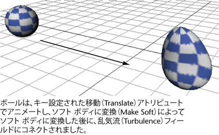 ソフト ボディのパーティクルに作用するダイナミクスは、非ダイナミック アニメーションの運動の影響を受けません。ダイナミクスは、オブジェクト上の他のアニメーションによるインフルエンスを受けないパーティクル オブジェクトのローカル空間内で発生します。