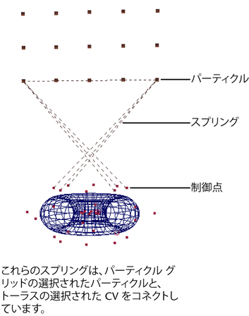 各スプリングにおいて、少なくとも一方のエンドポイントはパーティクル(またはソフト ボディのパーティクル)でなければなりません。エンド ポイントの一方がパーティクルでない場合、スプリングはエンドポイントのモーションには影響しませんが、エンドポイントのモーションはスプリングに影響します。