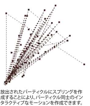 また、放出されたパーティクル間にスプリングを作成することもできます。これにより、ガス状のクラウドのような、パーティクルの塊を作成することができます。