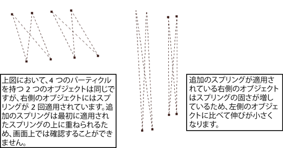 オブジェクトにスプリングを作成した後、さらにスプリングを追加したり、選択したスプリングを除去して、スプリング エフェクトを調整することができます。この機能は、スプリングが作成されていなかったポイント間のオブジェクトにさらにスプリングを追加する場合に便利です。また、同じポイントのペアに 2 つのスプリングを追加して、固さを向上させることができます。1 つの固いスプリングは、それよりも固くない 2 つのスプリングとは異なる作用を持ちます。