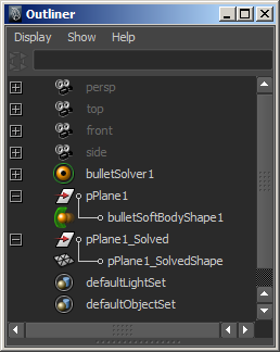Maya のポリゴン メッシュから Bullet ソフト ボディを作成することができます。ソフト ボディの作成時、元のポリゴン オブジェクト名と Solved というサフィックスが付いた新しいメッシュ ノードも作成されます。