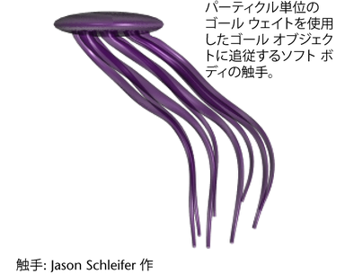 ゴールとは、パーティクルが進む目標とするオブジェクトです。ゴールを使用すると、それに追従するパーティクルによって、他のアニメーション技法では生成することが困難な流れるようなモーションを与えることができます。追従するパーティクルは、目に見えないスプリングでゴールに結び付けられているかのように動きます。ゴールの状況下では、ソフト ボディはパーティクルとみなされます。