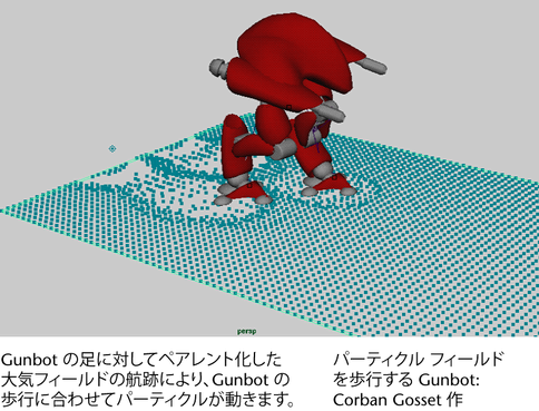 大気フィールドをオブジェクトの移動部分に対してペアレント化して、移動による大気の航跡(流れ)をシミュレートすることができます。たとえば、キャラクタが落ち葉や砂ぼこりの中を歩く場合、大気フィールドをキャラクタの足に対してペアレント化することができます。