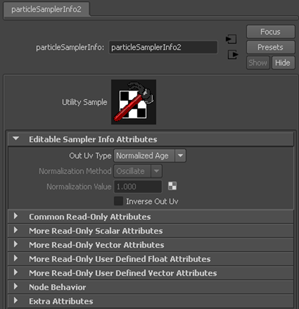 シェーダ アトリビュートを駆動するために使用するパーティクル アトリビュートにより、アトリビュート エディタ(Attribute Editor)または接続エディタ(Connection Editor)に新しいパーティクル サンプラ(Particle Sampler Info)ノードが表示されます。