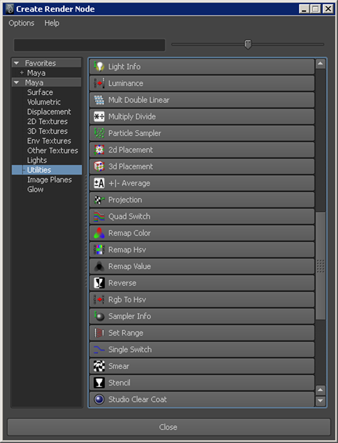 - レンダー ノードの作成(Create Render Node)ウィンドウの Maya の下にあるユーティリティ(Utilities)を選択します。