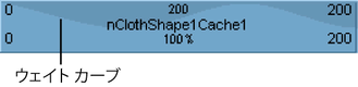 nCache クリップにウェイト カーブを作成することができます。これらのウェイト カーブを使用して、nCache クリップのシミュレーションがブレンド領域へイーズ イン、またブレンド領域からイーズ アウトする度合いを調整できます。