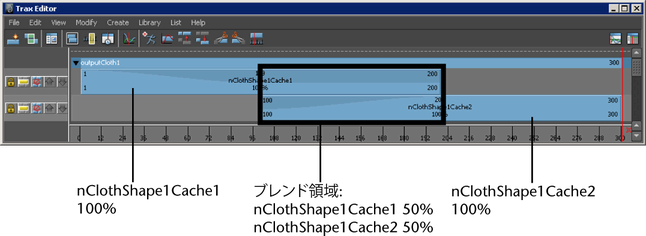 キャッシュ クリップのブレンドの平滑性はそれらのウェイト設定を調整、またはウェイト カーブを操作することで調整できます。たとえばフレーム 0 ~ 200 とフレーム 100 ~ 300 と、オーバーラップしている 2 つのキャッシュ クリップがあり、入力ウェイト(Input Weights)がともに 0.5 (50%)に設定されている場合、再生時のフレーム 100 ~ 200 では両方のキャッシュ クリップがオブジェクトの変形に等しく作用します。