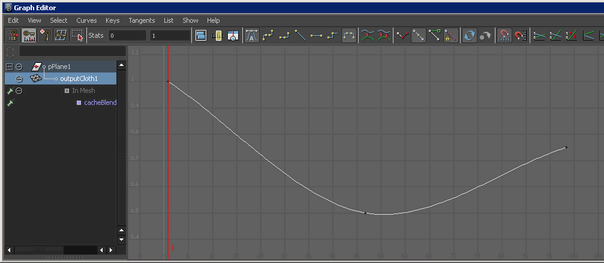グラフ エディタ(Graph Editor)が開き、グラフ ビューでは選択したキャッシュ クリップのウェイト カーブがフレームに収められています。