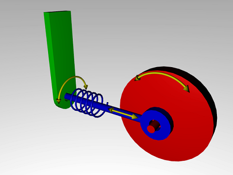 スプリング ヒンジ(Spring Hinge)には 3 つの自由度があります。これには、Z (軸 1)と X (軸 2)に沿った 2 つの回転自由度と、サスペンション スプリングを使用した、Z (軸 1)に沿った 1 つのトランスレーション自由度が含まれます。スプリング ヒンジ(Spring Hinge)コンストレイントは自動車のステアリング ホイールです。1 つの軸ではホイールを進ませることができ、他の軸ではホイールを回転できます。このケースでは、軸 1 を Y と位置合わせするために、X でスプリング ヒンジを -90 回転する必要があります。