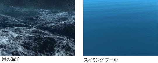 流体エフェクト(Fluid Effects)を使用すれば、しぶきが舞い上がる嵐の海洋からスイミング プールにいたるまで、リアルな水のサーフェスを簡単に作成できます。海洋(Ocean)または池(Pond)の流体を使用すると、これらの大海原のエフェクトを実現できます。