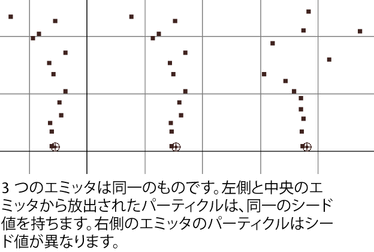 異なるシード値を持つ複数の nParticle オブジェクトによって 1 つのエミッタからパーティクルを放出させると、放出される位置は変化しますが、同じシード値を設定した場合は常に同じ位置から同じ方向に放出されます。