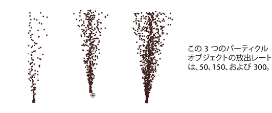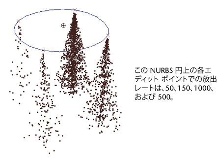 全方向またはディレクショナル ポイント エミッタのパーティクル、CV、頂点、エディット ポイント、またはラティス ポイントに対してそれぞれ異なる放出レートを使用することができます。たとえば、円上のエディット ポイントからリング状に火を放出する設定で、自然な火に見えるように不規則性を強調するためにそれぞれのポイントでの放出に変化を付けることができます。エミッタ タイプがサーフェスまたはカーブであるエミッタは、ポイントごとに放出を変更することはできません。