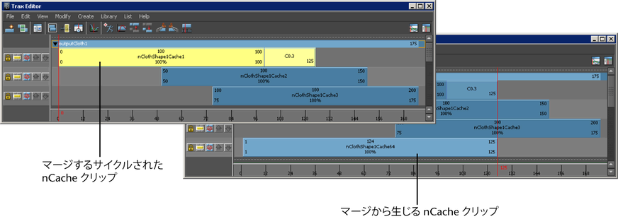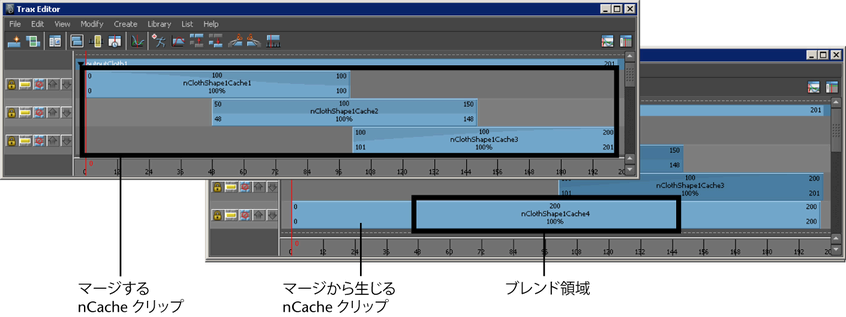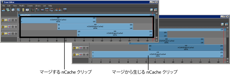 選択したすべてのオーバーラップしていない nCache は、キャッシュ クリップのマージ オプション(Merge Cache Clip Options)ウィンドウの設定に従ってマージされ、新しい nCache クリップ、キャッシュ ファイル、そしてディスクリプション ファイルが作成されます。「Trax エディタ(Trax Editor)の編集(Edit)メニュー」を参照してください。