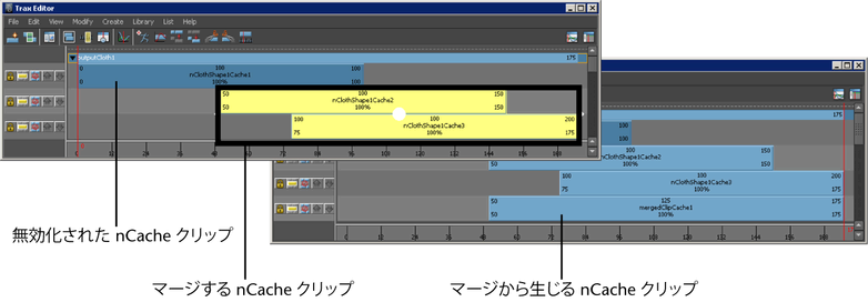 複数の nClache クリップを単一の新しい キャッシュ クリップにマージすることができます。マージするキャッシュ クリップは、同じトラックに順番で並んでいるクリップでも、異なるトラックのクリップでもかまいません。無効な nCache クリップは、マージできません。