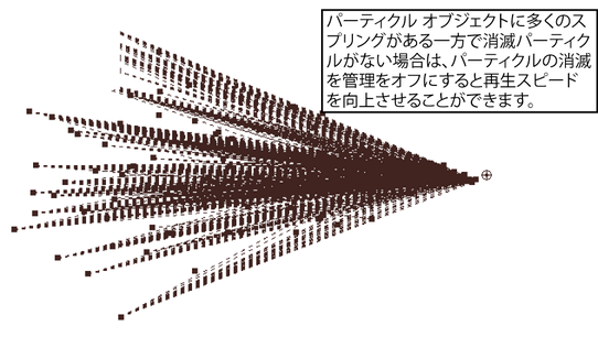 つまり、次のオブジェクトが消滅しないパーティクルを含んでいる場合、関連付けられているスプリング オブジェクトのパーティクルの消滅を管理(Manage Particle Death)をオフにすると、再生スピードを向上させることができます。