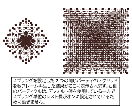 フォースがパーティクルに作用していないか、またはスプリング単位のレスト長をオンに設定したのにその値を設定していない可能性があります。既定では、スプリングの静止時の長さは元の長さと同じです。外部のフォースを適用しないと、スプリングは動きません。