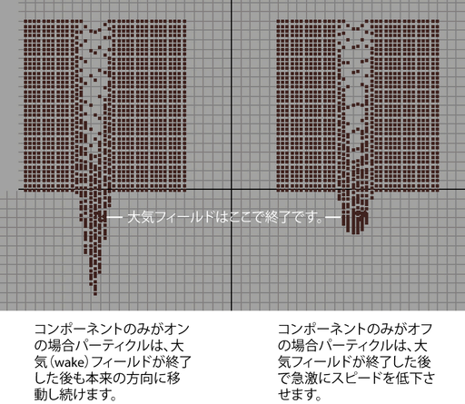 コンポーネントのみ(Component Only)がオンの場合、大気フィールドは、方向(Direction)、スピード(Speed)、および速度の継承(Inherit Velocity)アトリビュートの組み合わせで指定された方向にだけ力を適用します。また、この方向に沿ってオブジェクトを減速するために適用される力はありません。力はスピードを上げるためにのみ適用されます。