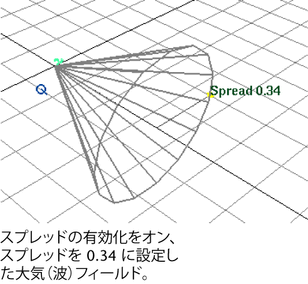 大気フィールドの影響を受けるオブジェクトが含まれる範囲を、方向(Direction)の設定を中心とした角度で表します。スプレッドの有効化(Enable Spread)がオンの場合、大気フィールドはオブジェクトをその原点から円錐状に押し出します。