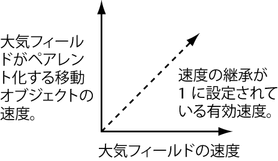 接続されたオブジェクトがどれだけ早く大気フィールドの速度と一致するかを制御します。スピード(Speed)を 0 に設定すると、オブジェクトは移動しません。スピード(Speed)を 1 に設定すると、オブジェクトの動きはただちに大気フィールドの速度と一致するようになります。