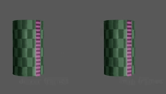 アトリビュート エディタ(Attribute Editor )の近接ラップ オプション(Proximity Wrap options)の新しい座標フレーム(Coordinate Frames)ドロップダウン メニューでは、既定のドライバ(Driver)ベースの方法から選択するか、新しいスナップ(Snap)オプションを使用することができます。これにより、変形がドライバの単一のポリゴンに従うようになり、ジオメトリのリンクルが減少します。