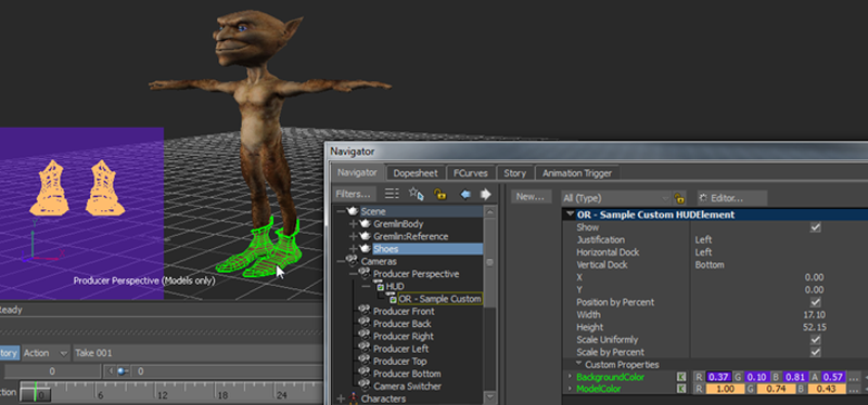 In the following figure, the sample custom HUD element shows a currently selected model in the viewport.