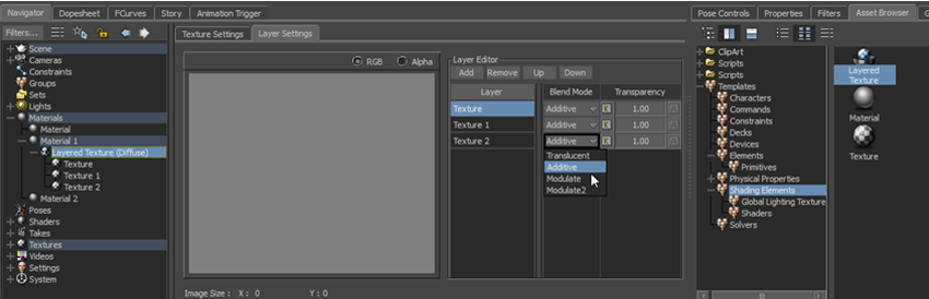 By default, MotionBuilder supports Translucent, Additive, Modulate, and Modulate2 blending modes, but you can subclass the FBLayeredTexture class and extend its functionality easily. For example, see the sample in