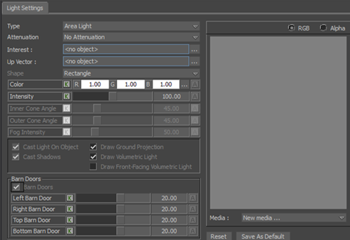 The light models now include more features such as, animatable barn door properties, spot light type includes inner and outer cone settings to create penumbra, and area light type (rectangle and sphere shapes) are available for soft shadow. The FBX file format can transfer these properties seamlessly to Maya and other DCC tools. The new light types and properties are shown in the following figure.