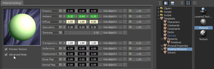 The following figure shows the Material Settings pane. You can connect many properties in this pane to the texture objects.