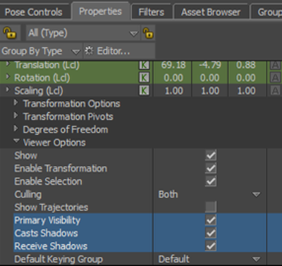Three new properties are added to the models: Primary Visibility, Casts Shadows, and Receive Shadows. The custom renderer uses these properties to access the shadow setting for each model and align with other DCC tools. The following figure shows these properties for the Model object.