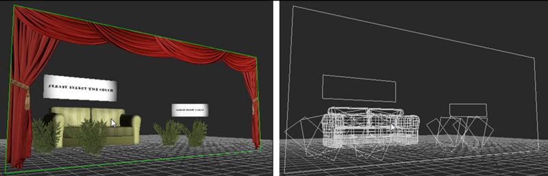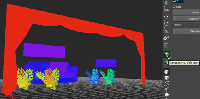 As shown in the following figure, you cannot pick through the transparent portion of the curtain to select the couch behind it in this mode.