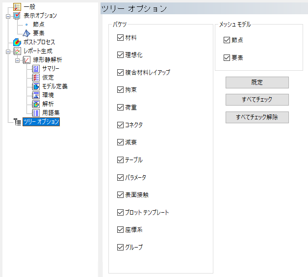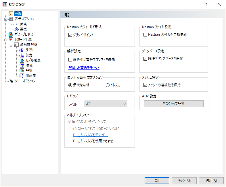 一部のプログラム設定はグローバルです。すべてのモデルの動作に影響します。チュートリアルの作成時点では次の既定の設定が有効になっています。チュートリアルの手順の有効性を確保するには、下に示す設定を維持する必要があります。これらの設定にアクセスするために、まず Autodesk Inventor Nastran の環境に入ります([環境]