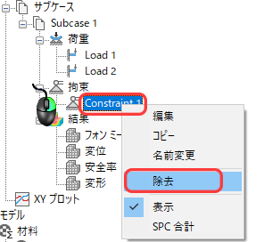 荷重を除去するには、ツリーでその荷重を右クリックして、[除去]を選択します。モデル内で目的の条件が上の図のようにハイライト表示されるのを確認して、荷重を正しく選択してください。