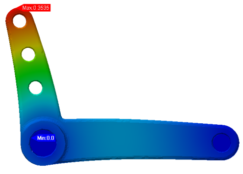 4 番目の演習では、拘束を実際にピンで固定されるパーツに置き換え、対称を使用して剛体運動を拘束し、接触を使用してレバー アームとピンの間の相互作用と動きをモデリングしました。この手法を組み合わせて、物理的に最も現実的な解析シナリオを実現し、次のような変形の結果を得ました。