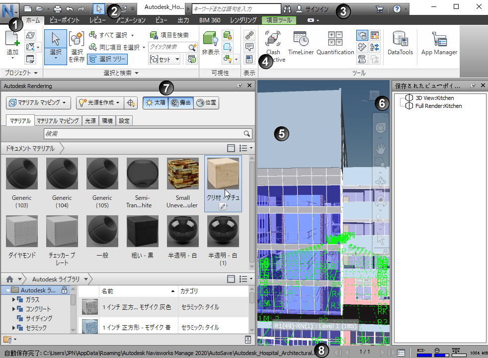 このセクションでは、標準的な Navisworks ユーザ インタフェースの主要コンポーネントについて概説します。