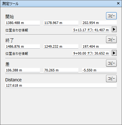 どの測定の場合も、[開始]点と[終了]点の X、Y、Z 座標が、[差]と絶対[距離]の情報とともにテキスト ボックスに表示されます。累積的な測定(ポイントライン、累積など)を使用する場合は、その測定に登録されているすべての点の累積距離が[距離]に表示されます。