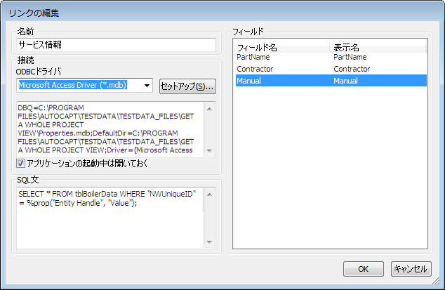 元のモデルファイル(例: AutoPlant)と同じ名前のデータベースを選択する場合は、次のように入力します: DBQ=%join(%removeext(%removepath(%sourcepath)),".mdb"); DRIVER={Microsoft Access Driver (*.mdb)};