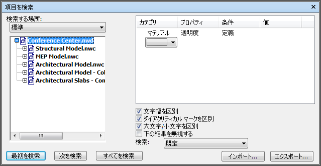 それぞれのカテゴリ名とプロパティ名は 2 つの部分から成っています、Navisworks インタフェースに表示されるユーザ文字列と、表示されない内部文字列(主に API で使用)です。既定では、両方の部分について項目が照合されますが、必要に応じて、1 つの部分でのみ照合するよう、Navisworks に指示することもできます。たとえば、ユーザ名を無視して検索を行い、内部名だけで項目を照合することもできます。これは、保存した検索を、Navisworks のローカライズ バージョンを使用している可能性のあるユーザと共有する場合に便利です。