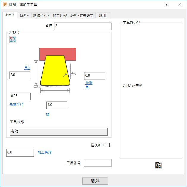 インサート タブを使用し、旋削工具の加工部のジオメトリを定義します。旋削工具タイプにより、有効になるオプションが異なります。