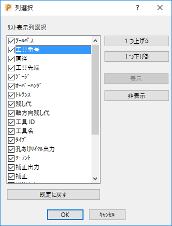 列ビューをカスタマイズするには、列選択 ダイアログを使用します。これにより、NC プログラム および 工具データベース ダイアログに表示される情報の量を制御し、優先順位を決定できます。