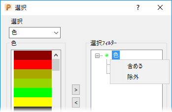 選択フィルター で 色 を右クリックして、コンテキスト メニューの 除外 を選択するとします。