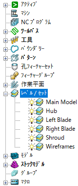 ブリスクを加工するには、各ブリスクコンポーネントが、レベル、または、セットに格納されている必要があります。この例のモデルには、使用するセット、および、レベルが含まれています。
