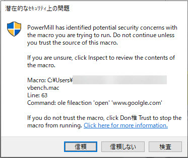 PowerMill は、PowerMill 内からマクロを実行する際に、セキュリティ上の問題が発生する可能性があるかどうかを確認します。マクロ内にセキュリティ上の問題(潜在的な有害コマンドなど)がある場合、PowerMill は、安全に実行できるかどうかそれらのコマンドを検査するようプロンプトを表示します。