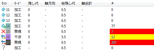 各ツールパスで干渉回避または無視されたクランプ サーフェスの数は、[コンポーネント残し代] ダイアログの対応する行に表示されます。